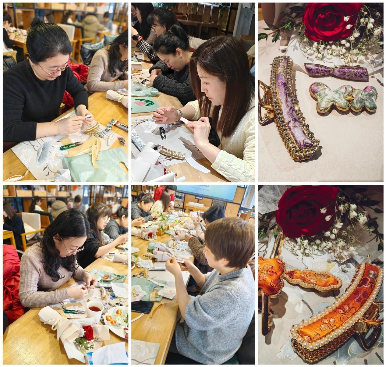 本次活动特邀专业手作导师现场授课,带领参与者沉浸式感受国家级非物质文化遗产——宋锦的独特魅力。导师们从宋锦的历史渊源、纹样寓意与织造工艺讲起,细致讲解发夹制作的选材、剪裁、拼接与定型等全流程,并逐一指导实操细节。参与活动的老师们凝神专注、细致创作,将细腻雅致的宋锦面料化作一枚枚精巧别致的发夹。